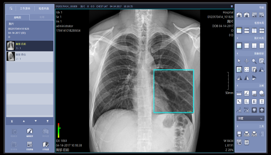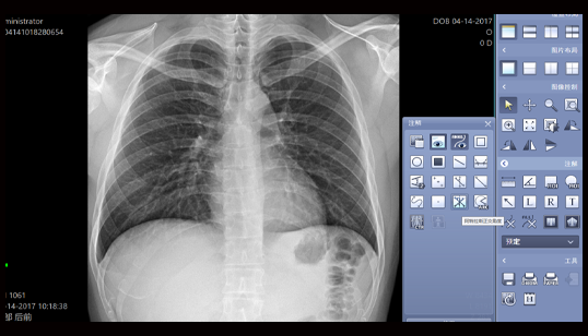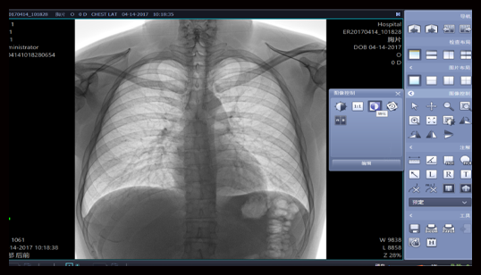 可调节窗宽窗位、对比度、亮度,进行图像放大、测量、拼接、三维重建等操作